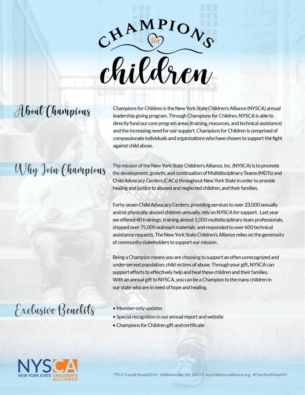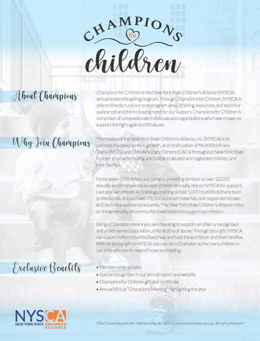 The New York State Children's Alliance, Inc. is pleased to welcome everyone to the Champions for Children leadership giving program