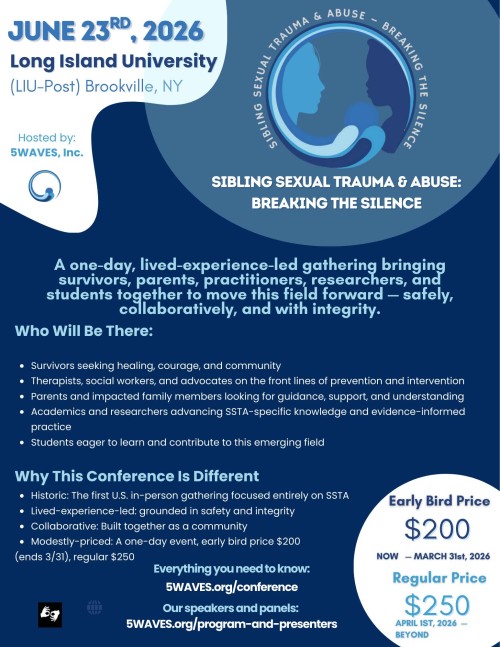 5WAVES, Inc, a NY-based grassroots 501c3 nonprofit, dedicated to increasing awareness and services for sibling sexual abuse is hosting the first conference in the US specifically on sibling sexual abuse, titled Sibling Sexual Trauma and Abuse: Breaking the Silence, in NYS, at Long Island University, Post Campus in Brookville.